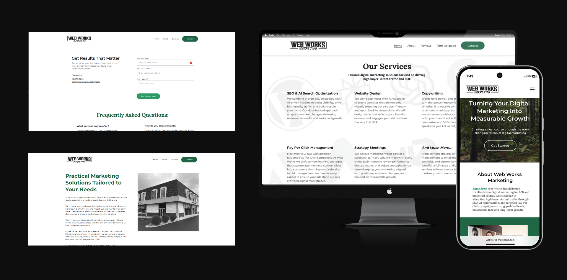 This showcase highlights a collection of commercial design and digital marketing work created while working at Web Works Marketing. Some of my work at this agency included website design, print collateral, digital advertising assets, and multimedia content. In addition to visual design, I was also tasked with managing and optimizing digital marketing campaigns for over 20 businesses. I developed my skills in SEO, keyword research, conversion-focused copywriting, and various AI tools.