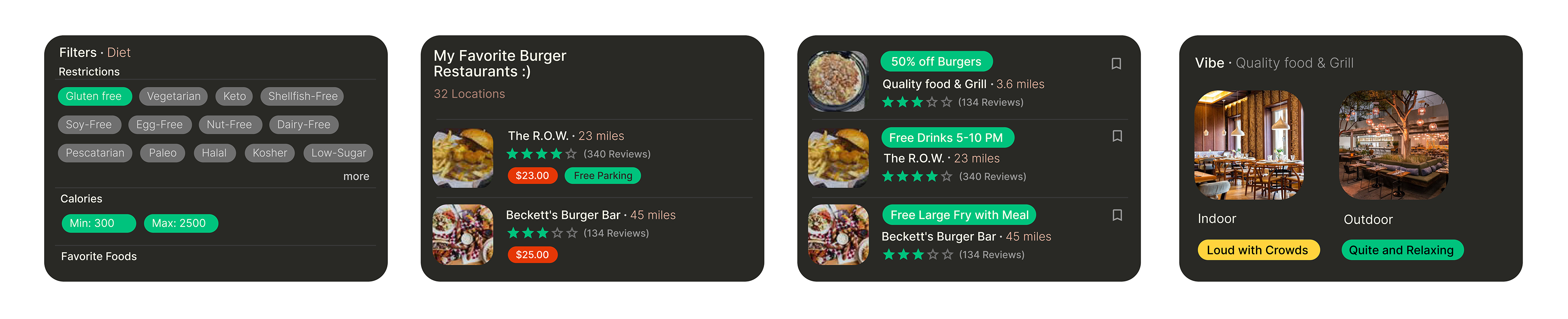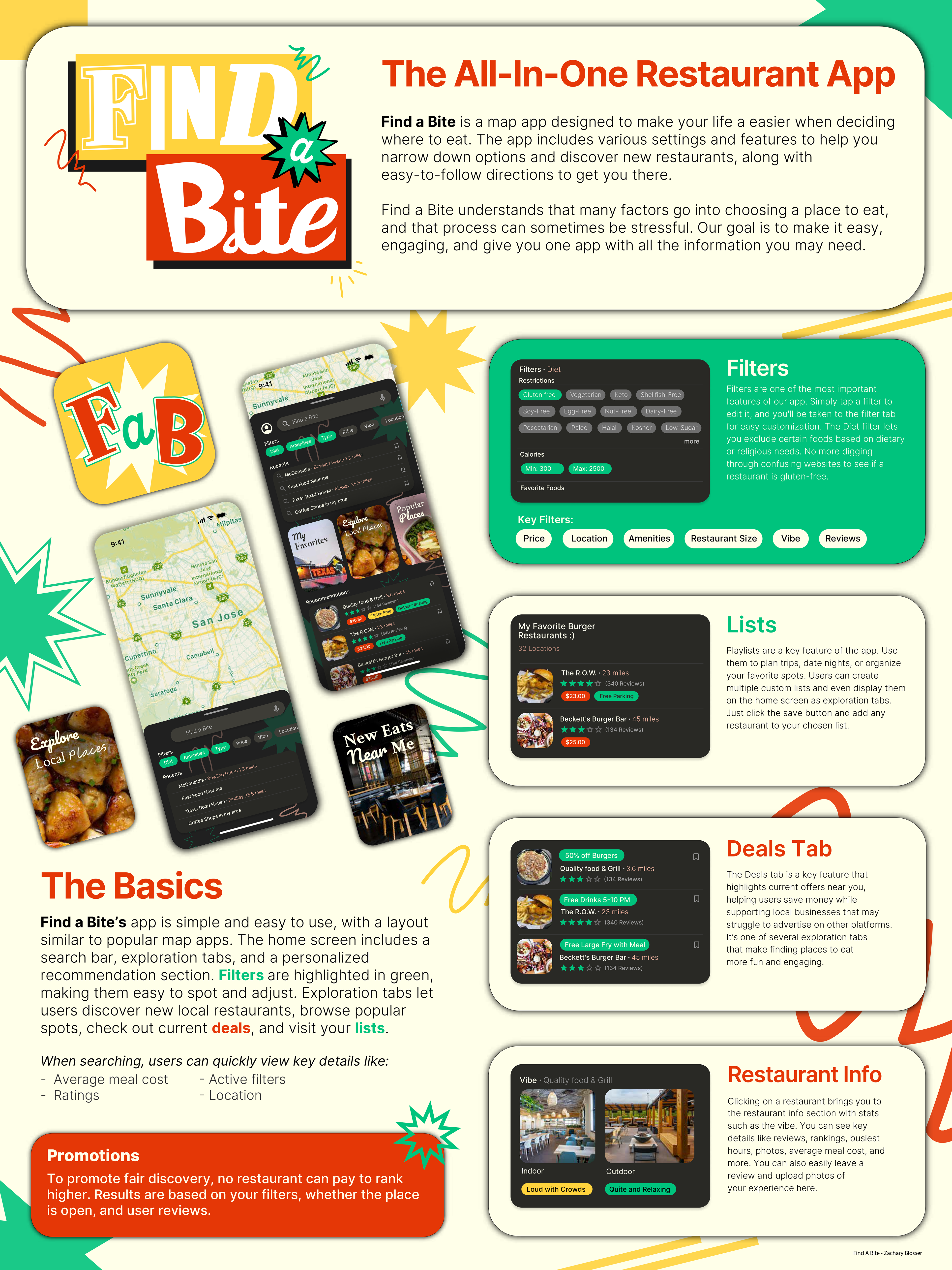 Find a Bite is a mobile app concept design focused on simplifying the frustration of searching for restaurants. Besides a built in map feature, a key feature of this app is the wide range of filters from dietary filters to price range. Additional features include discovery tabs for exploring new places, the ability to create custom lists, and information on the vibe of the restaurant. By combining these tools into a single interface, this app makes the decision-making process of finding food much easier and quicker.