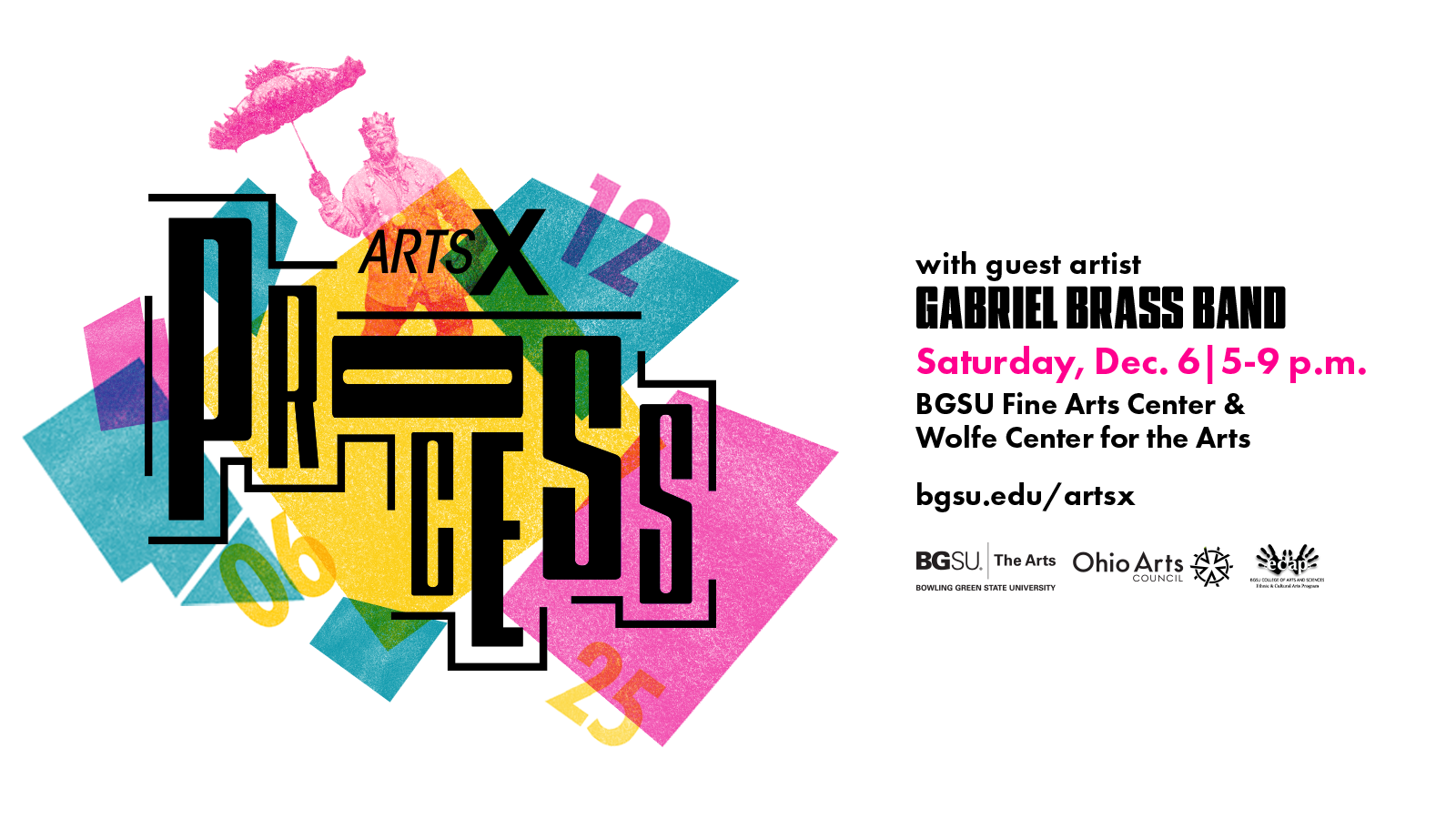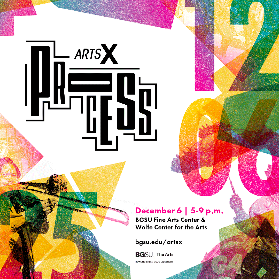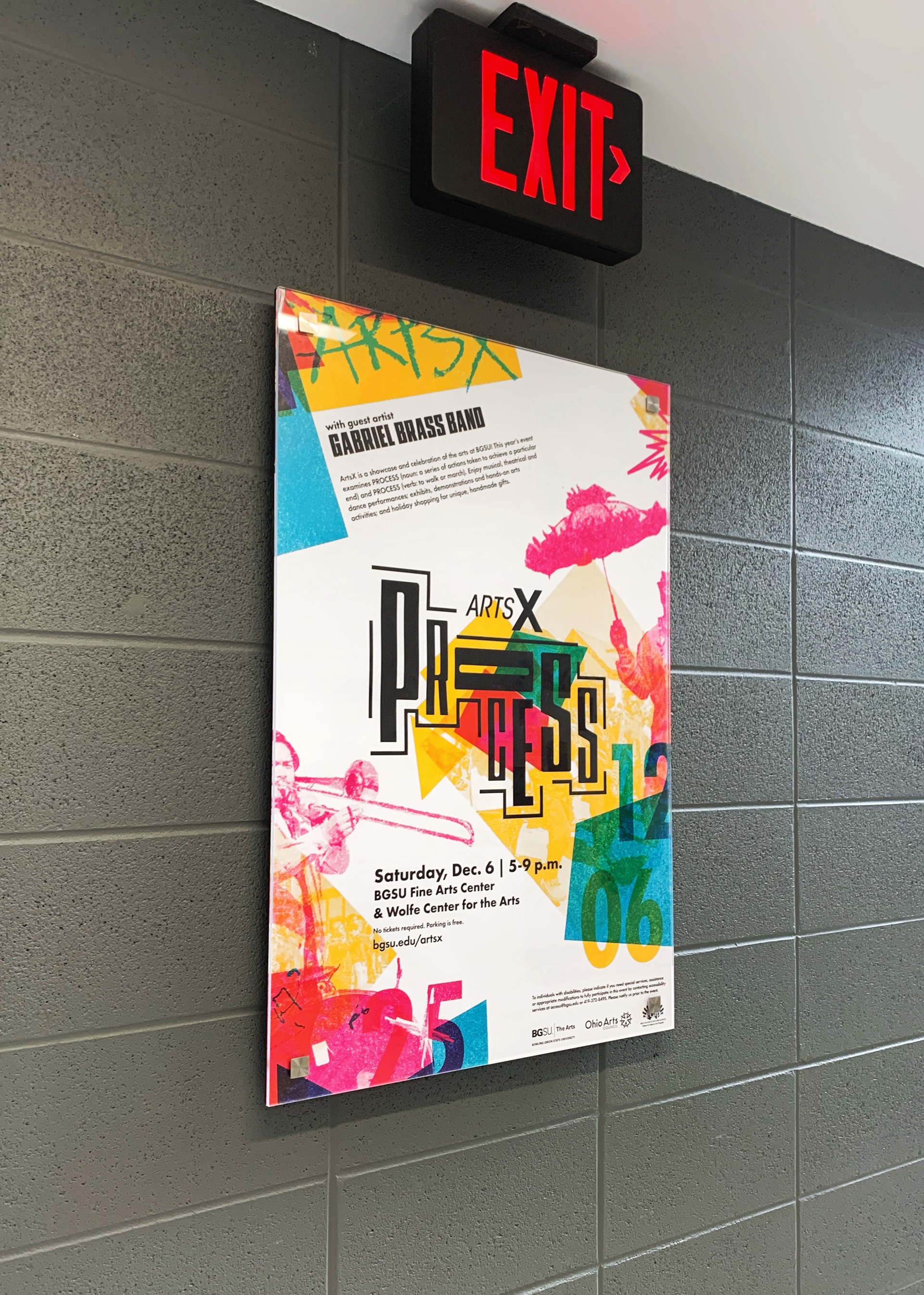 Every year, Bowling Green State University hosts a winter arts festival called ARTSX, a one-day, campus-wide event featuring every art discipline offered at BGSU, along with performances, crafts, and shopping. Each year’s event includes a new theme and guest artist. This year’s theme, Process / Process, explored the dual definition of the word - both the act of creation and movement. The guest artist for the event was the Gabriel Brass Band. Two other designers and I were chosen to create a visual system around this theme for the event.