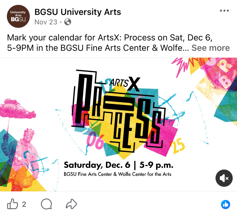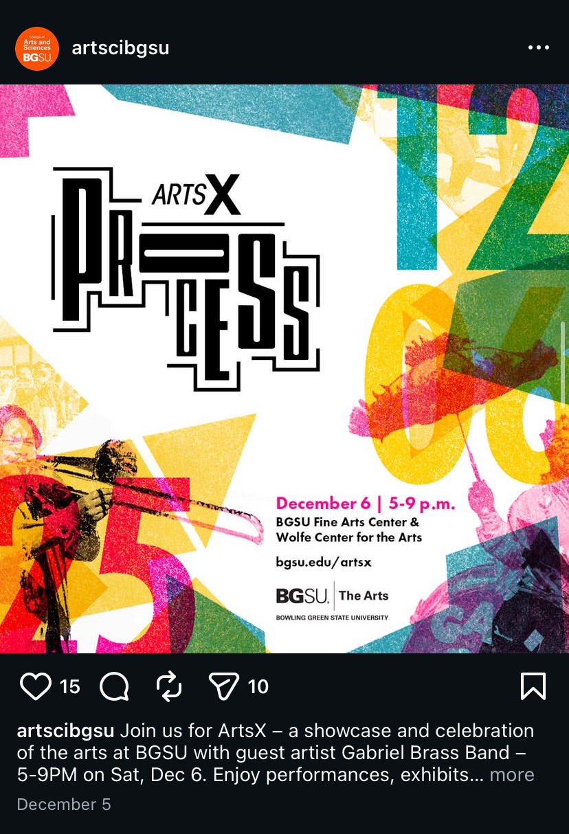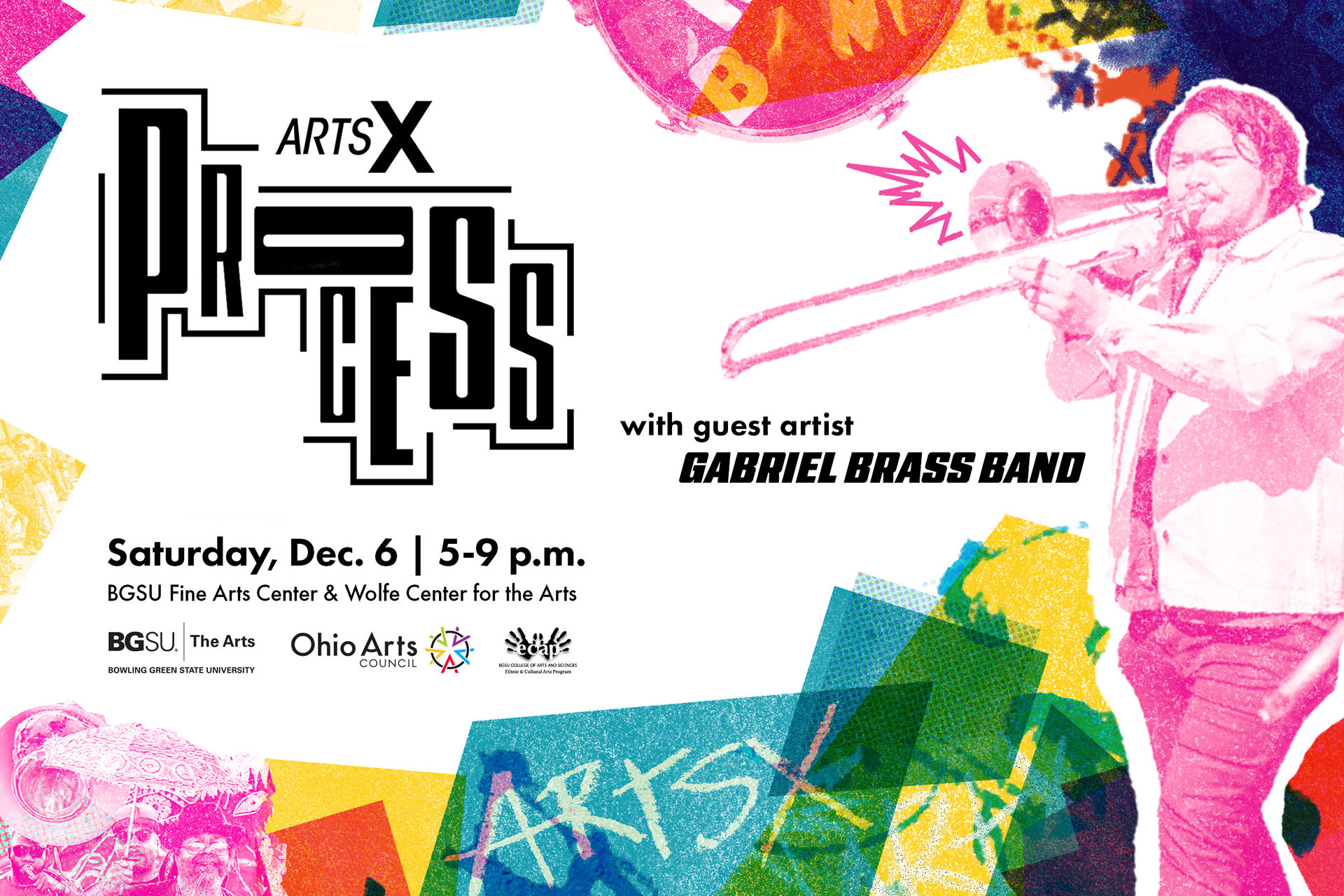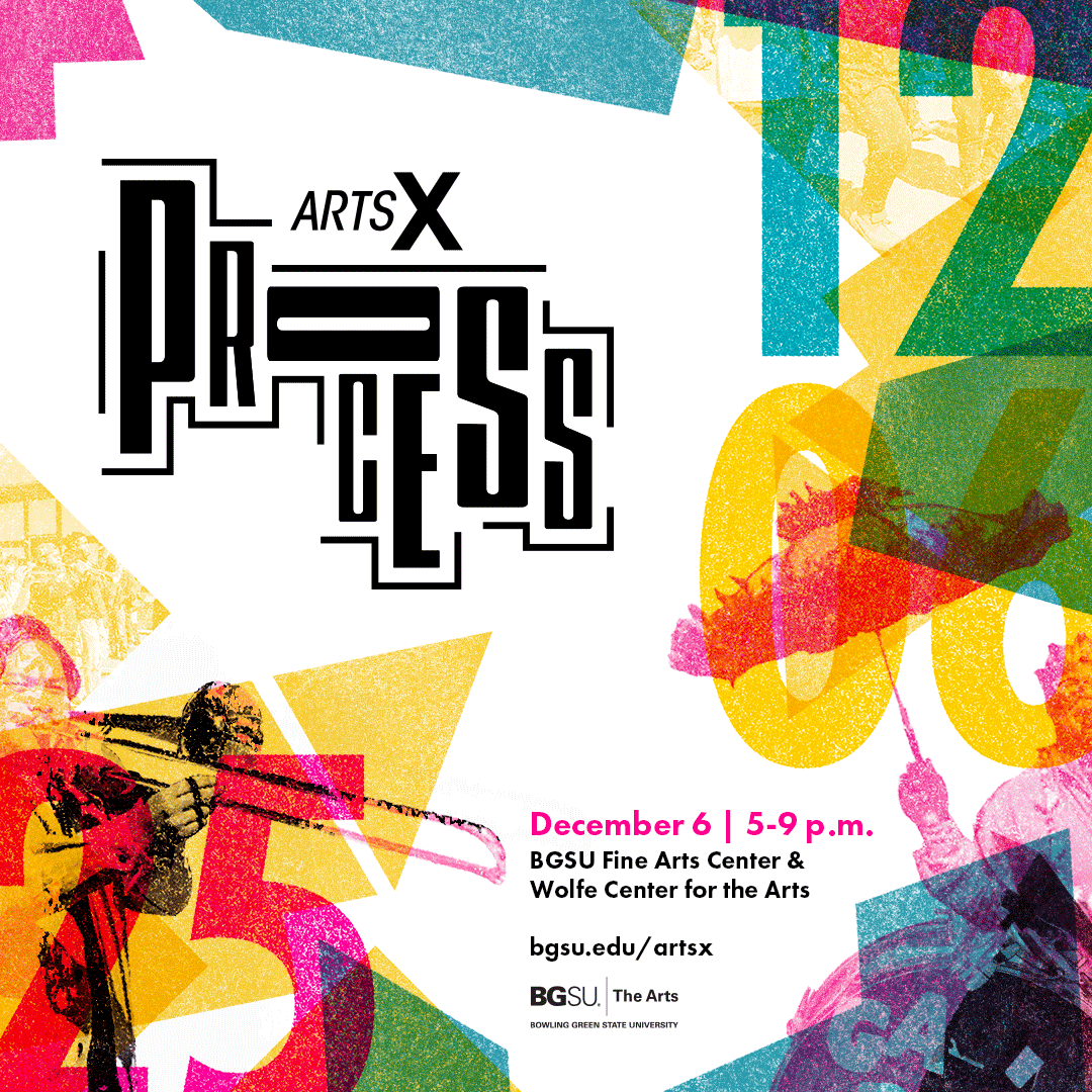 Every year, Bowling Green State University hosts a winter arts festival called ARTSX, a one-day, campus-wide event featuring every art discipline offered at BGSU, along with performances, crafts, and shopping. Each year’s event includes a new theme and guest artist. This year’s theme, Process / Process, explored the dual definition of the word - both the act of creation and movement. The guest artist for the event was the Gabriel Brass Band. Two other designers and I were chosen to create a visual system around this theme for the event.