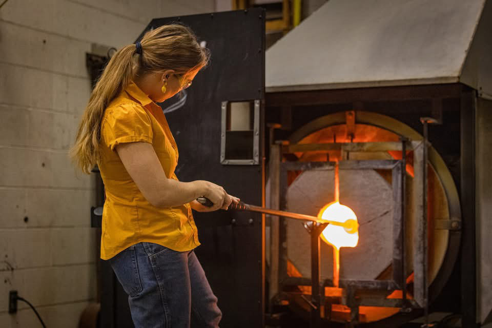 The graphic shapes reference the different sides of one of the main art buildings, the Wolfe Center, while overlapping colors visually communicate the idea of process through layering and interaction.