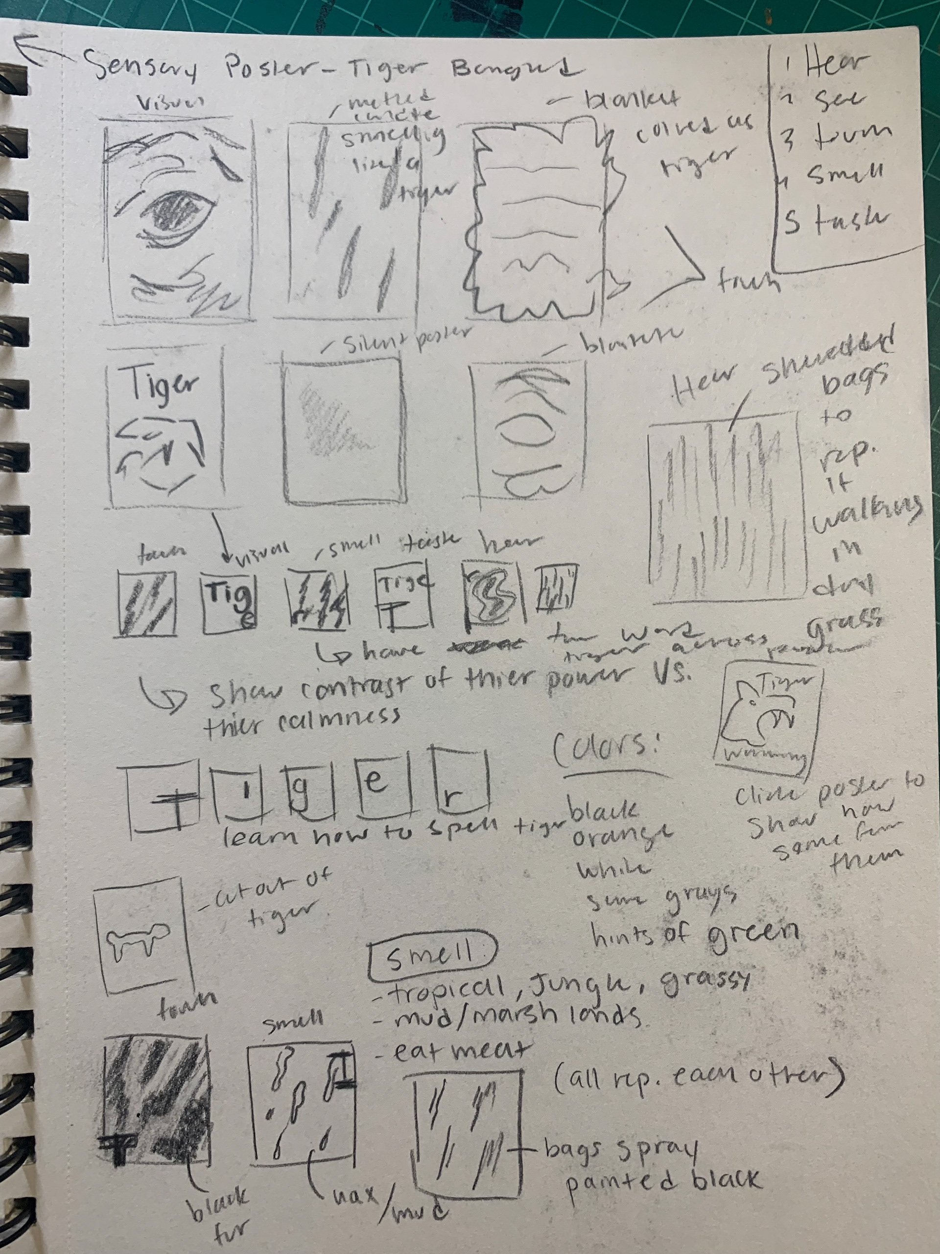 This academic poster series was created to raise awareness about the decline of tiger populations. Each poster is designed to appeal to a different sense using various materials and textures such as salt or wood to create a more immersive experience. The goal of this project is to appeal to other senses besides visuals to convey the issue of declining tiger populations. This creates a more impactful takeaway for the audience.